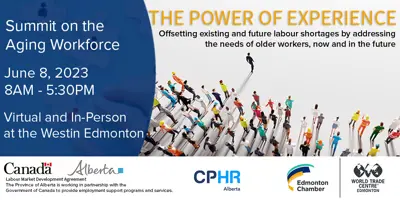 The Edmonton Chamber of Commerce in partnership with CPHR Alberta is proudly hosting the “Summit on the Aging Workforce” on Thursday, June 8, 2023 at The Westin Edmonton. Attracting and supporting a diverse workforce is key to the success of any business. With widespread labour and workforce talent shortages threatening growth and sustainability, many organizations are looking at their recruitment and retention strategies. Mature workers, those that are 55 years or older, make up nearly 20% of the labour force and can help offset existing and future labour shortages, and mentor younger workers. Some older workers face barriers to remaining employed, re-entering the labour force, or delaying retirement.