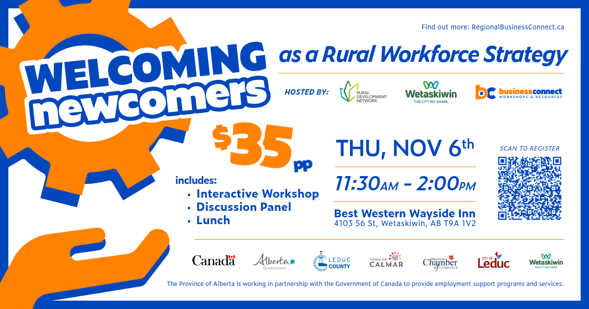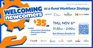 On Thursday, Nov. 6 from 11:30 a.m. to 2 p.m. at the Best Western Wayside Inn, Wetaskiwin, business connect is hosting a luncheon and workshop on Welcoming Newcomers as a Rural Workforce Strategy.